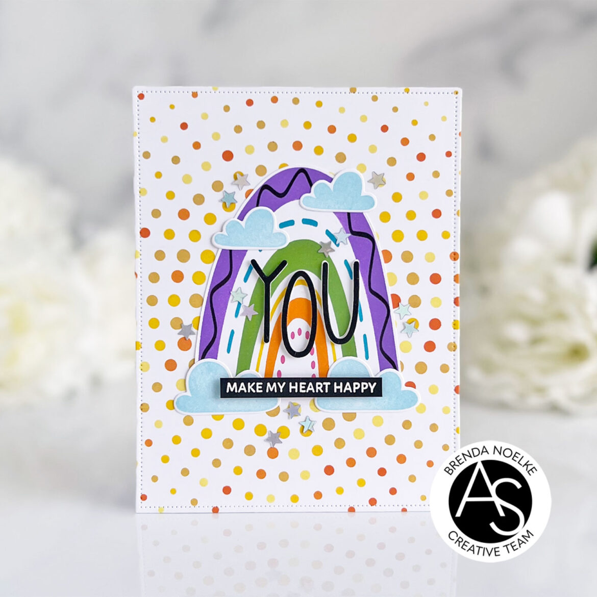 The clouds were stamped onto white cardstock with Tumbled Glass Distress Oxide Ink using stamps from the Always Be Yourself Stamp Set, then cut out with the Coordinating Dies. The rainbow and clouds were adhered to the background with liquid glue.