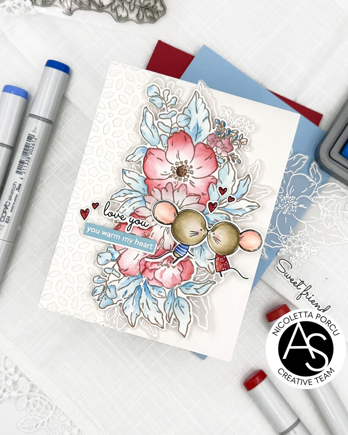 I continued by stamping the lovely mouse couple from the Sweet Friend stamp set. I colored it with Copic markers and I die cut it using the Sweet Friend coordinate die set and I glued it over the right side of the flowers.