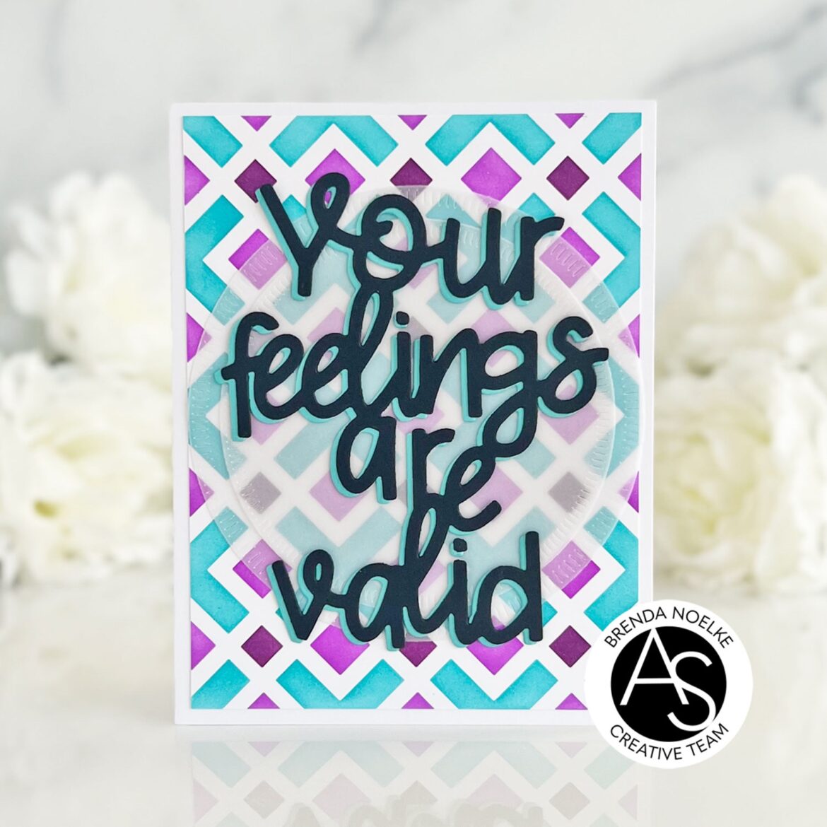 Next, I die-cut the sentiment from black and aqua cardstock using the Your Feelings Are Valid Die. I layered and adhered them together with liquid glue.